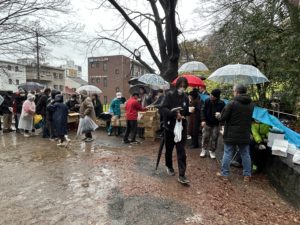 食事の後には雨の中でも今池駅交差点で路傍伝道し、景雲橋小園ホームレス礼拝に参加し、